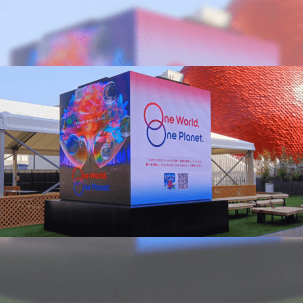 2025年日本国際博覧会の会場内(シンガポール館北側・休憩所前)に、3m×3mサイズの4面LEDビジョンで構成されたCubeモニュメントの施工および表示システム構築を行いました。